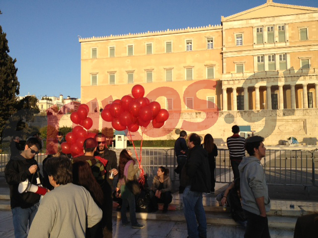 Μια δέσμη από κόκκινα μπαλόνια αμόλησαν πριν από λίγη ώρα στον αέρα οι συγκεντρωμένοι Αγανακτισμένοι στο Σύνταγμα.