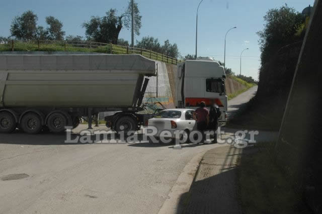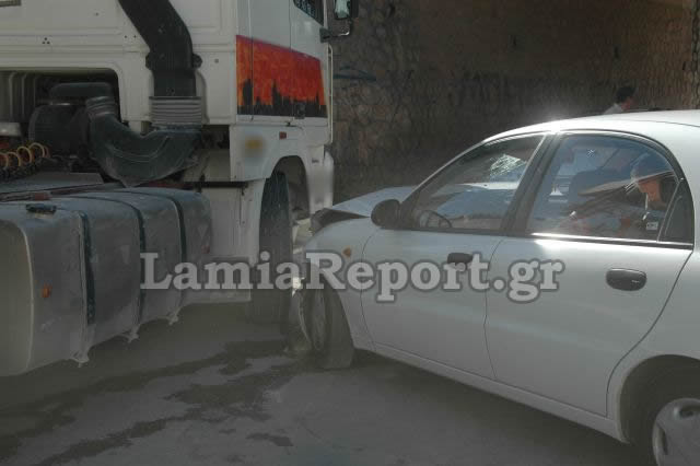 Το λευκό αυτοκίνητο στο οποίο, εκτός από τον οδηγό, επέβαιναν δύο ακόμη γυναίκες, έπεσε πάνω στη ρόδα του τεράστιου φορτηγού. Από τη σύγκρουση τραυματίστηκε η συνοδηγός, η οποία διακομίσθηκε στο νοσοκομείο Λαμίας, όπου νοσηλεύεται εκτός κινδύνου.