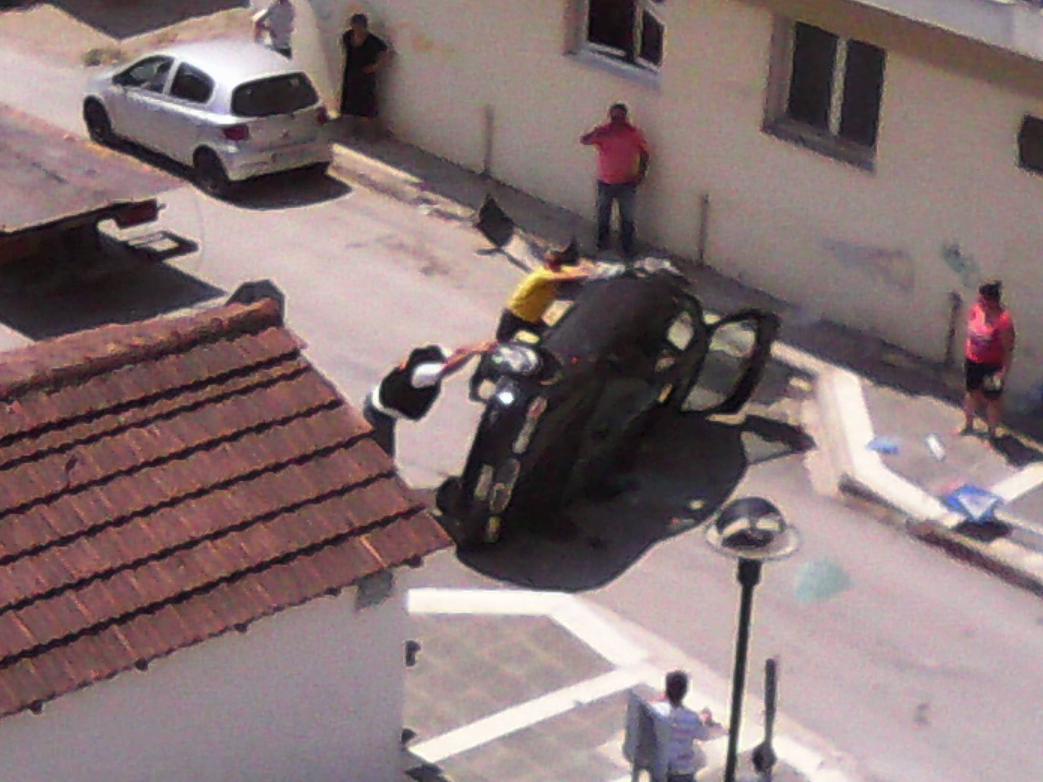 Ένα αγροτικό φορτηγάκι κι ένα Ι.Χ. αυτοκίνητο συγκρούστηκαν πλαγιομετωπικά, με αποτέλεσμα να αναποδογυρίσει το δεύτερο και να εγκλωβιστούν μέσα σ’ αυτό, αρχικά τρία άτομα, τα οποία, με τη βοήθεια περαστικών, απεγκλωβίστηκαν.