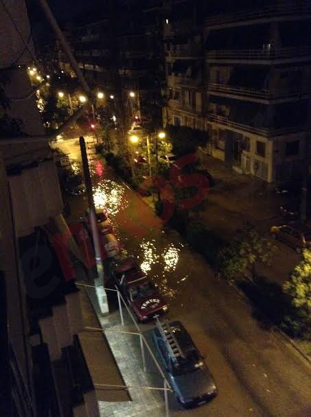Πρόκειται για την οδό Σκρα, κεντρικό δρόμο της Καλλιθέας, που δεν χρειάστηκε παρά λίγα λεπτά έντονης βροχόπτωσης για να μετατραπεί σε ποταμό.