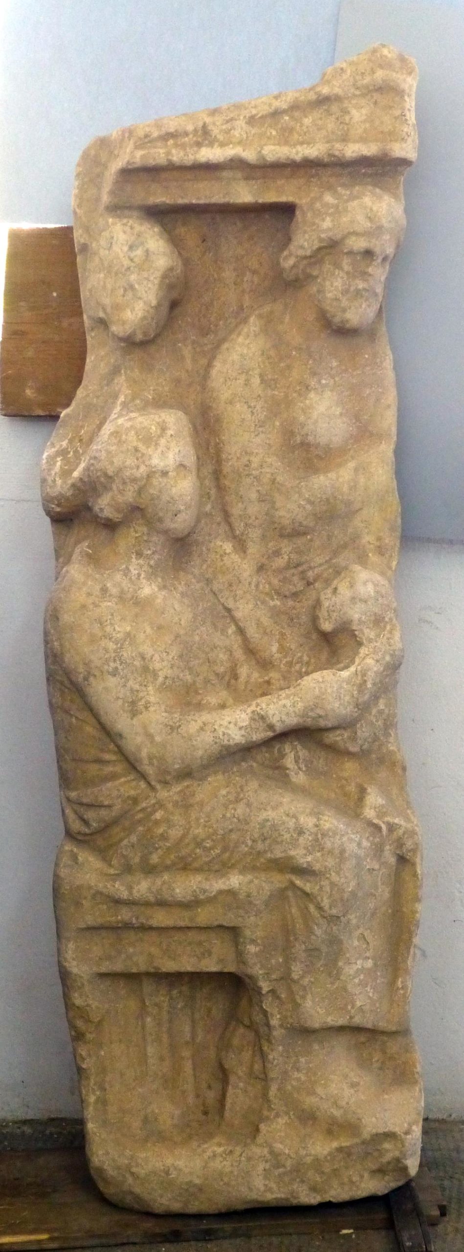 Σύμφωνα με δημοσίευση στην ιστοσελίδα του Γερμανικού Αρχαιολογικού Ινστιτούτου, πρόκειται για τμήμα επιτύμβιας στήλης, που απεικονίζει ανάγλυφα σε πρώτο επίπεδο μια καθιστή γυναίκα και ένα κοριτσάκι και σε δεύτερο επίπεδο μια άλλη γυναίκα και έναν γενειοφόρο άνδρα. Οι μορφές βρίσκονται κάτω από ανάγλυφο επιστύλιο αετώματος, όπου υπάρχει δυσανάγνωστη επιγραφή, από την οποία ξεχωρίζει το όνομα «Δημόστρατος».