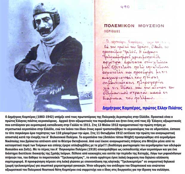 Το αεροπλάνο αυτό πιλοτάριζε το 1913 ο πρώτος Έλληνας πιλότος Δημήτριος Καμπέρος. Η Κυβέρνηση Ελ. Βενιζέλου το 1911 είχε την προνοητικότητα να στείλει 4 Έλληνες αξιωματικούς στη Γαλλία να εκπαιδευτούν ως πιλότοι από τον Henri farman. Οι δύο πρώτοι ήταν ο Καμπέρος και ο Μουτούσης.