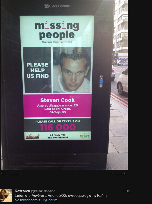 Το πρόσωπο του Βρετανού Steven Cook στις στάσεις του Λονδίνου αναζητεί κάποιον που μπορεί να γνωρίζει πληροφορίες για την…. εξαφάνισή του. Ο νεαρός χάθηκε το Σεπτέμβριο του 2005 στην Κρήτη και η οικογένειά του προσπαθεί να μάθει τι του έχει συμβεί.