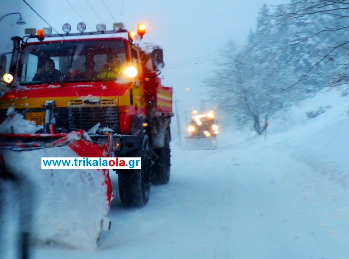 Τα μηχανήματα της Περιφερειακής Ενότητας Τρικάλων, προσπαθούν να κρατήσουν ανοιχτό το επαρχιακό δίκτυο του Νομού, καθαρίζοντας συνεχώς το οδόστρωμα και ρίχνοντας αλάτι.