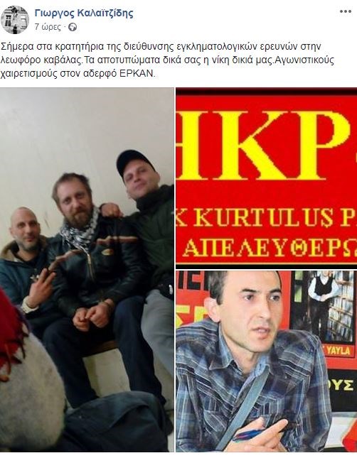 Στην ανάρτησή του στο Facebook το ηγετικό στέλεχος του Ρουβίκωνα, Γιώργος Καλαϊτζίδης γράφει: ”Σήμερα στα κρατητήρια της διεύθυνσης εγκληματολογικών ερευνών στην λεωφόρο καβάλας. Τα αποτυπώματα δικά σας η νίκη δικιά μας. Αγωνιστικούς χαιρετισμούς στον αδερφό ΕΡΚΑΝ”.