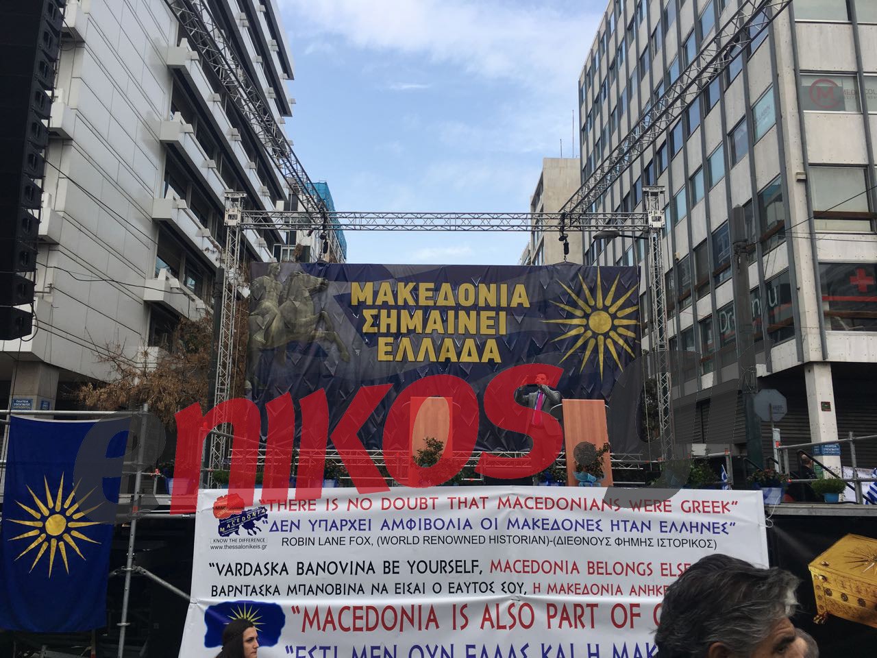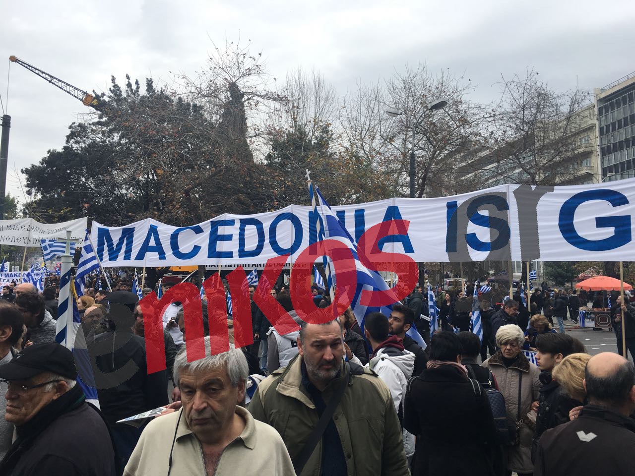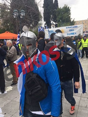 Ο κόσμος που έχει αρχίσει ήδη να συγκεντρώνεται στο Σύνταγμα, κρατά πανό και ελληνικές σημαίες, ενώ άλλοι φορούν ακόμη και περικεφαλαίες.