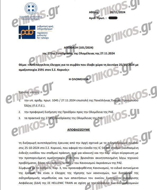 Συγκεκριμένα, σύμφωνα με την απόφαση της 273ης Συνεδρίασης της Ολομέλειας που πραγματοποιήθηκε την Τετάρτη (27/11) και δημοσιεύει το enikos.gr αποφασίστηκε η διεξαγωγή αυτεπάγγελτης έρευνας από την Αρχή, σχετικά με το σιδηροδρομικό συμβάν στις 25-10-2024 στο Σ.Σ. Κορινού, που αφορά την είσοδο της IC 54 στο σταθμό (λανθασμένη ένδειξη εισόδου του σταθμού πράσινη, αντί για κόκκινη) και την παρ΄ολίγο σύγκρουση με την προπορευόμενη αμαξοστοιχία 2591 που βρισκόταν ακινητοποιημένη λόγω τεχνικού προβλήματος, βάσει του άρθρου 5, παρ. 2 του Κανονισμού Ακροάσεων της ΡΑΣ.