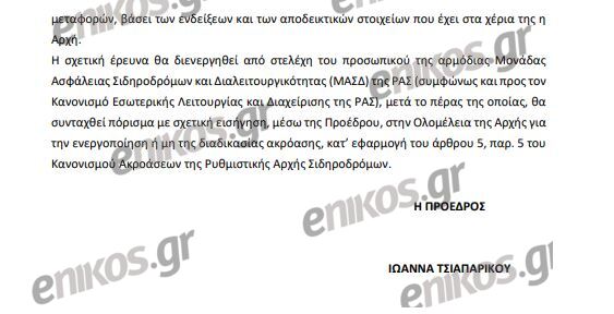 «Σύμφωνα με το άρθρο 5, παρ. 3, του προαναφερθέντος Κανονισμού, το ειδικό αντικείμενο της έρευνας θα είναι ο έλεγχος της τήρησης των κανονισμών, των διατάξεων της σιδηροδρομικής νομοθεσίας και των απαιτήσεων του οικείου Συστήματος Διαχείρισης Ασφάλειας (ΣΔΑ) της ΣΕ Hellenic Train σε σχέση με την ασφάλεια των σιδηροδρομικών μεταφορών, βάσει των ενδείξεων και των αποδεικτικών στοιχείων που έχει στα χέρια της η Αρχή.