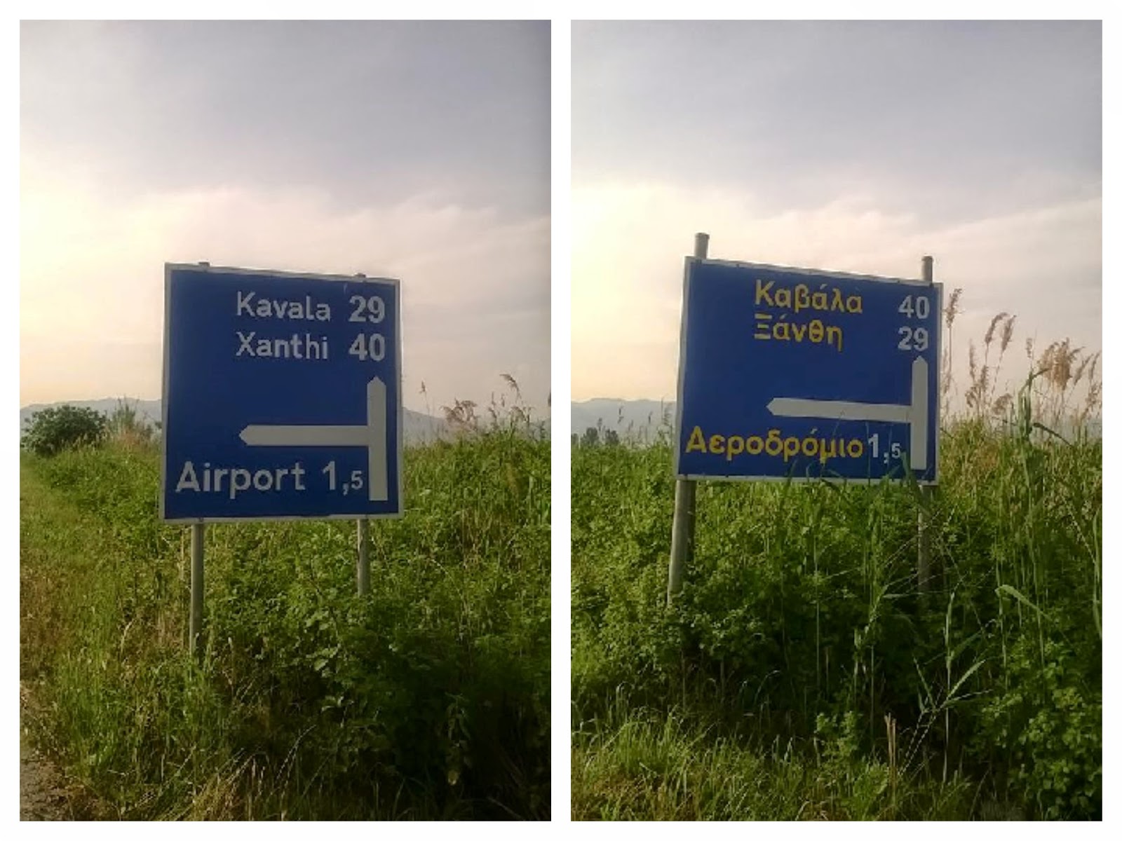 Πρόκειται για μια πινακίδα γραμμένη στα Ελληνικά, η οποία παρέχει πληροφορίες σχετικά με την απόσταση που πρέπει να διανύσει κανείς για να φτάσει τόσο στην Ξάνθη όσο και στην Καβάλα, αλλά και στο αεροδρόμιο της περιοχής, καθώς και μια ακόμη πινακίδα που δίνει ακριβώς τις ίδιες οδηγίες αλλά γραμμένες στα Αγγλικά, όπως αναφέρει η ιστοσελίδα thrakitoday.com.
