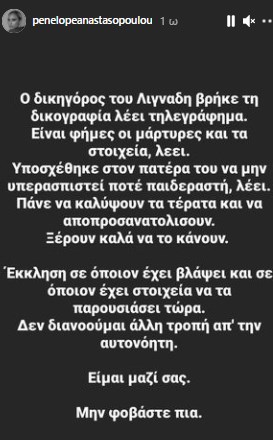 Με ανάρτησή της στον προσωπικό της λογαριασμό στο Instagram, η Πηνελόπη Αναστασοπούλου σχολίασε τις δηλώσεις του δικηγόρου του Δημήτρη Λιγνάδη, Αλέξη Κούγια, ενώ παράλληλα απεύθυνε έκκληση σε όποιον έχει στοιχεία να τα παρουσιάσει τώρα.