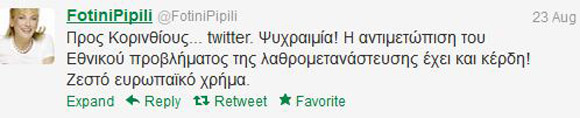 Δείτε τι συμβουλεύει -μέσω twitter- τους Κορινθίους η Φωτεινή Πιπιλή…