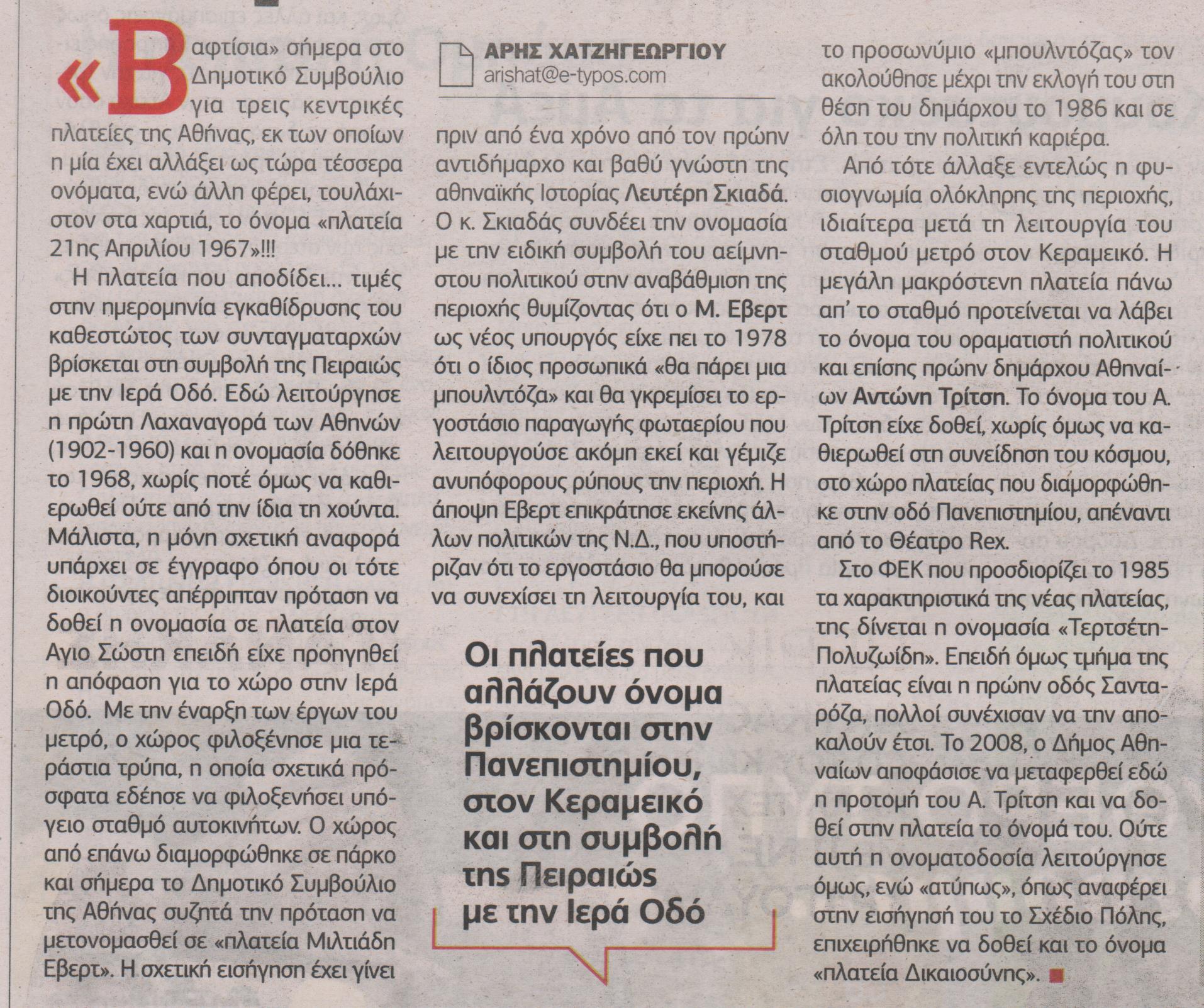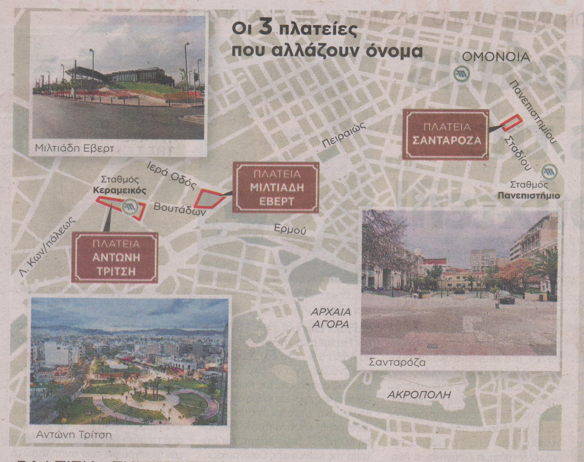 “Βαφτίσια” σήμερα στο Δημοτικό Συμβούλιο για τρεις κεντρικές πλατείες της Αθήνας, εκ των οποίων η μία έχει αλλάξει ως τώρα τέσσερα ονόματα, ενώ άλλη φέρει τουλάχιστον στα χαρτιά, το όνομα “πλατεία” 21ης Απριλίου 1967!