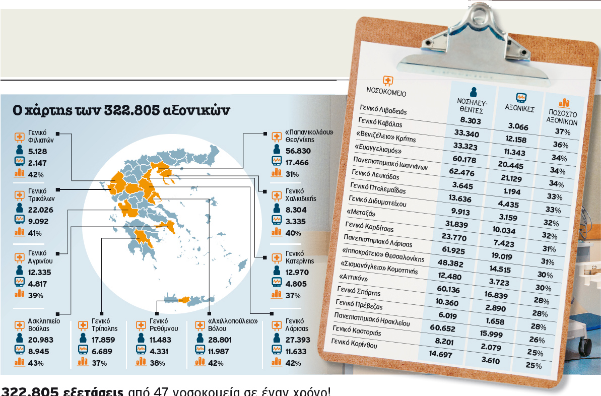 Την πρώτη θέση στη λίστα των εξετάσεων κατέχει το «Ασκληπιείο» της Βούλας, όπου το 43% των ασθενών υποβλήθηκαν σε αξονική τομογραφία. Πολύ υψηλά βρίσκονται τα νοσοκομεία Βόλου, Λάρισας και Φιλιατών (42%) και τα νοσοκομεία Τρικάλων (41%), Χαλκιδικής (40%), Αγρινίου (39%) και Ρεθύμνου (38%).