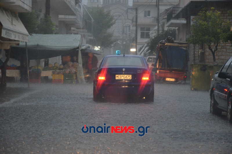 Από τις έξι το πρωί ισχυρή καταιγίδα πλήττει την πόλη του Μεσολογγίου. Οι δρόμοι της πόλης έχουν μετατραπεί σε “ποτάμια” και η πυροσβεστική υπηρεσία δέχεται συνέχεια κλήσεις από σπίτια και καταστήματα για άντληση υδάτων.