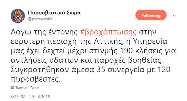 Από το Πυροσβεστικό Σώμα, ανακοινώθηκε μέσω Twitter, ότι λόγω της έντονης βροχόπτωσης, η Υπηρεσία δέχθηκε μέχρι στιγμής 190 κλήσεις για αντλήσεις υδάτων και παροχές βοήθειας. Όπως αναφέρει, συγκροτήθηκαν άμεσα 35 συνεργεία με 120 πυροσβέστες.