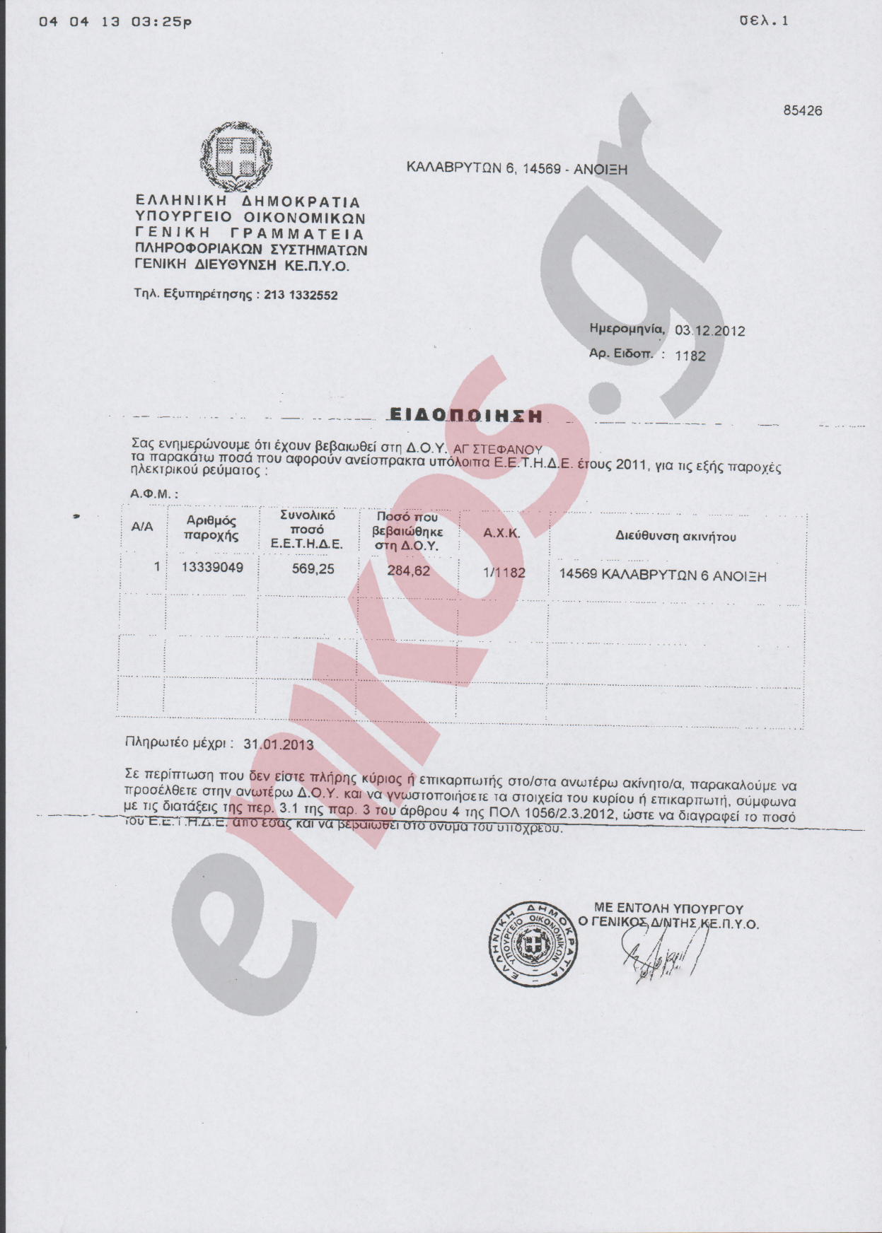 Σύμφωνα με το Υπουργείο Οικονομικών, έχουν βεβαιωθεί στη ΔΟΥ Αγίου Στεφάνου ανείσπρακτα υπόλοιπα Ε.Ε.Τ.Η.Δ.Ε, το έτους 2011, τα οποία ο αναγνώστης του enikos.gr, τα είχε καταβάλει με τον λογαριασμό της Hellas Power που λάμβανε εκείνη την περίοδο.