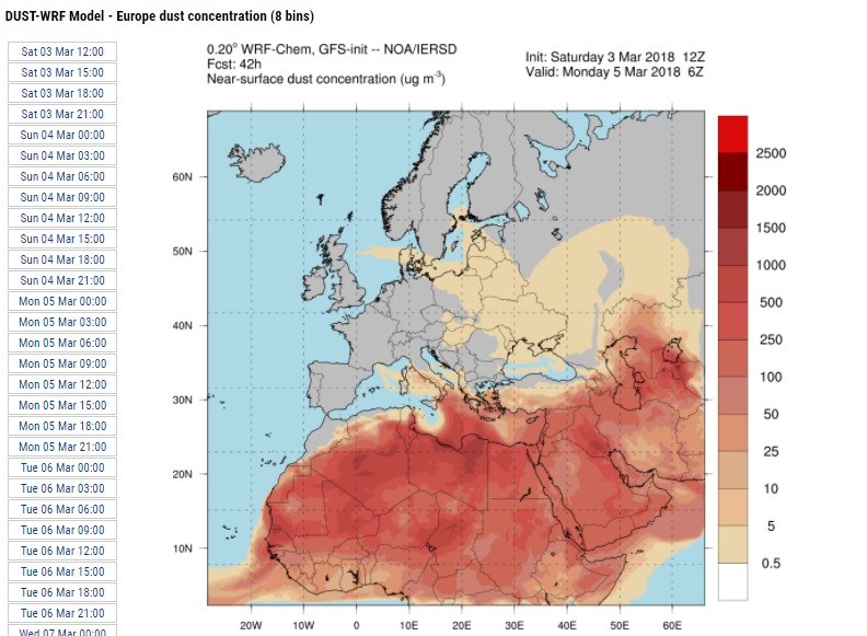 Συγκεκριμένα σύμφωνα με τις προβλέψεις της Εθνικής Μετεωρολογικής Υπηρεσίας, η συγκέντρωση αιωρούμενων σωματιδίων PM10, αναμένεται να ξεπεράσει το όριο της μέσης ημερήσιας τιμής 50 μg/m3 και το φαινόμενο, το οποίο θα παρουσιάσει διακυμάνσεις, θα διαρκέσει μέχρι και τη Δευτέρα 05 -03-2018 με βάση την παρούσα πρόγνωση, οπότε και θα υποχωρήσει σταδιακά.