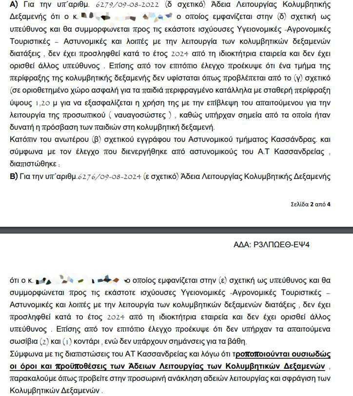 «Σύμφωνα με τις διαπιστώσεις του ΑΤ Κασσανδρείας και λόγω ότι τροποποιούνται ουσιωδώς οι όροι και προϋποθέσεις των Άδειων Λειτουργίας των Κολυμβητικών Δεξαμενών, παρακαλούμε όπως προβείτε στην προσωρινή ανάκληση αδειών λειτουργίας και σφράγιση των Κολυμβητικών Δεξαμενών» αναφέρεται στα πρακτικά της δημοτικής επιτροπής.