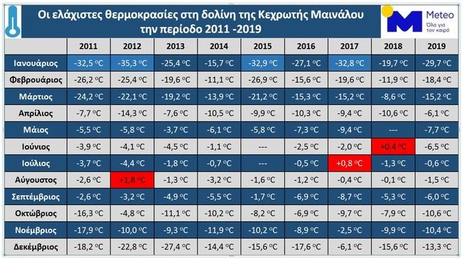 Στον πίνακα που ακολουθεί παρουσιάζονται οι απολύτως ελάχιστες θερμοκρασίες ανά μήνα για την περίοδο 2011-2019