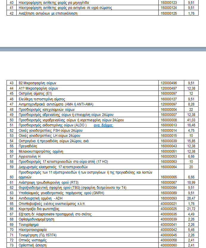 Έπειτα από μελέτη του σχετικού καταλόγου κωδικοποίησης, ο οργανισμός «έβγαλε» από το σύστημα κωδικούς εξετάσεων, για τις οποίες έχει παρατηρηθεί ότι υπήρχαν συχνά διπλές καταχωρήσεις της ίδιας εξέτασης, κάποιες περιλαμβάνονται σε άλλες εξετάσεις, άλλες είναι παρωχημένες και δεν χρησιμοποιούνται στη σύγχρονη ιατρική πράξη, ενώ αρκετές περιλαμβάνονται στην ιατρική επίσκεψη και δεν τιμολογούνται μεμονωμένα.