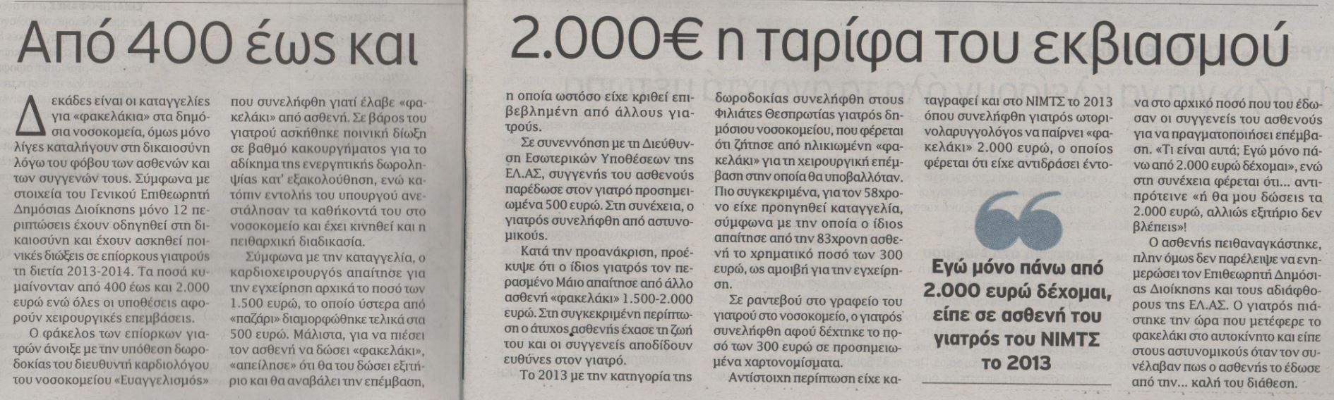 Μετά τον σάλο που προκλήθηκε από τον άδικο χαμό του καρδιοπαθούς, ο οποίος για να εγχειριστεί  «πλήρωσε» τον θεράποντα ιατρό του, το «Έθνος» αποκαλύπτει την περίπτωση του χειρουργού από την Θεσσαλονίκη ο οποίος συνελήφθη επ΄αυτοφώρω να παίρνει φακελάκι 500 ευρώ τον Μάρτιο του 2011. Ο συγκεκριμένος γιατρός καταδικάστηκε από τη δικαιοσύνη αλλά τελικά «αθωώθηκε» από το Κεντρικό Πειθαρχικό Συμβούλιο (ΚΠΣ) Ιατρών ΕΣΥ με απόφαση που ελήφθη την 1-7-14.