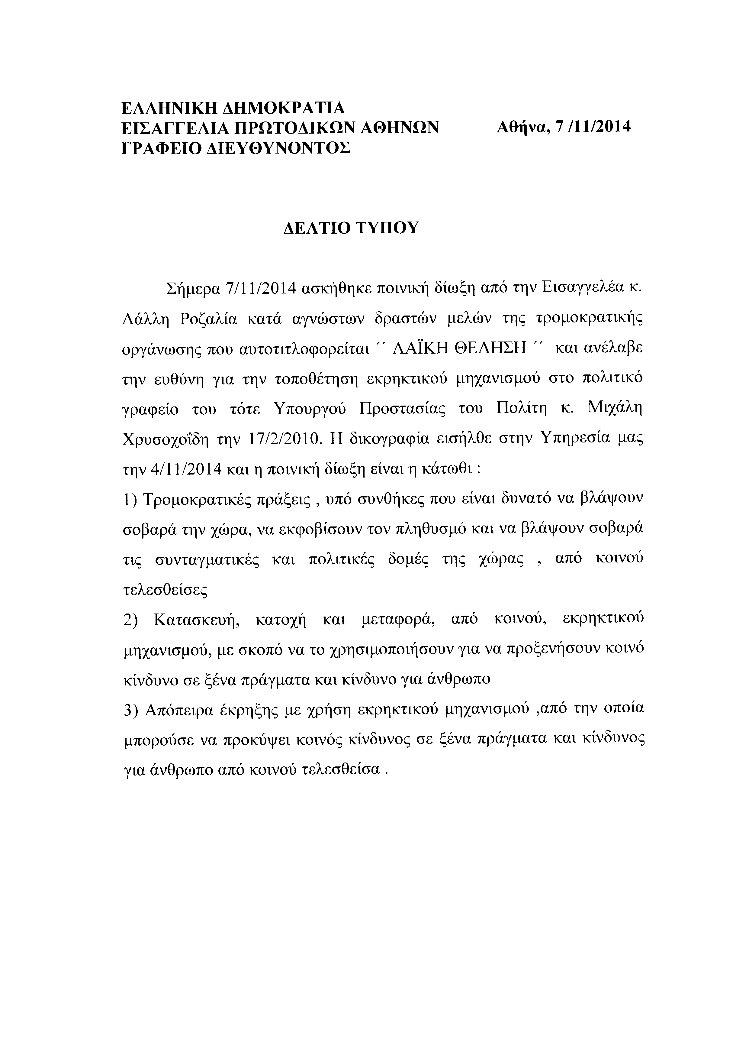 Ποινική δίωξη ασκήθηκε κατά αγνώστων δραστών μελών της τρομοκρατικής οργάνωσης Λαϊκή Θέληση, η οποία ανέλαβε την ευθύνη για την επίθεση με εκρηκτικό μηχανισμό στο πολιτικό γραφείο του τότε υπουργού Προστασίας του Πολίτη, Μιχάλη Χρυσοχοϊδη το 2010.