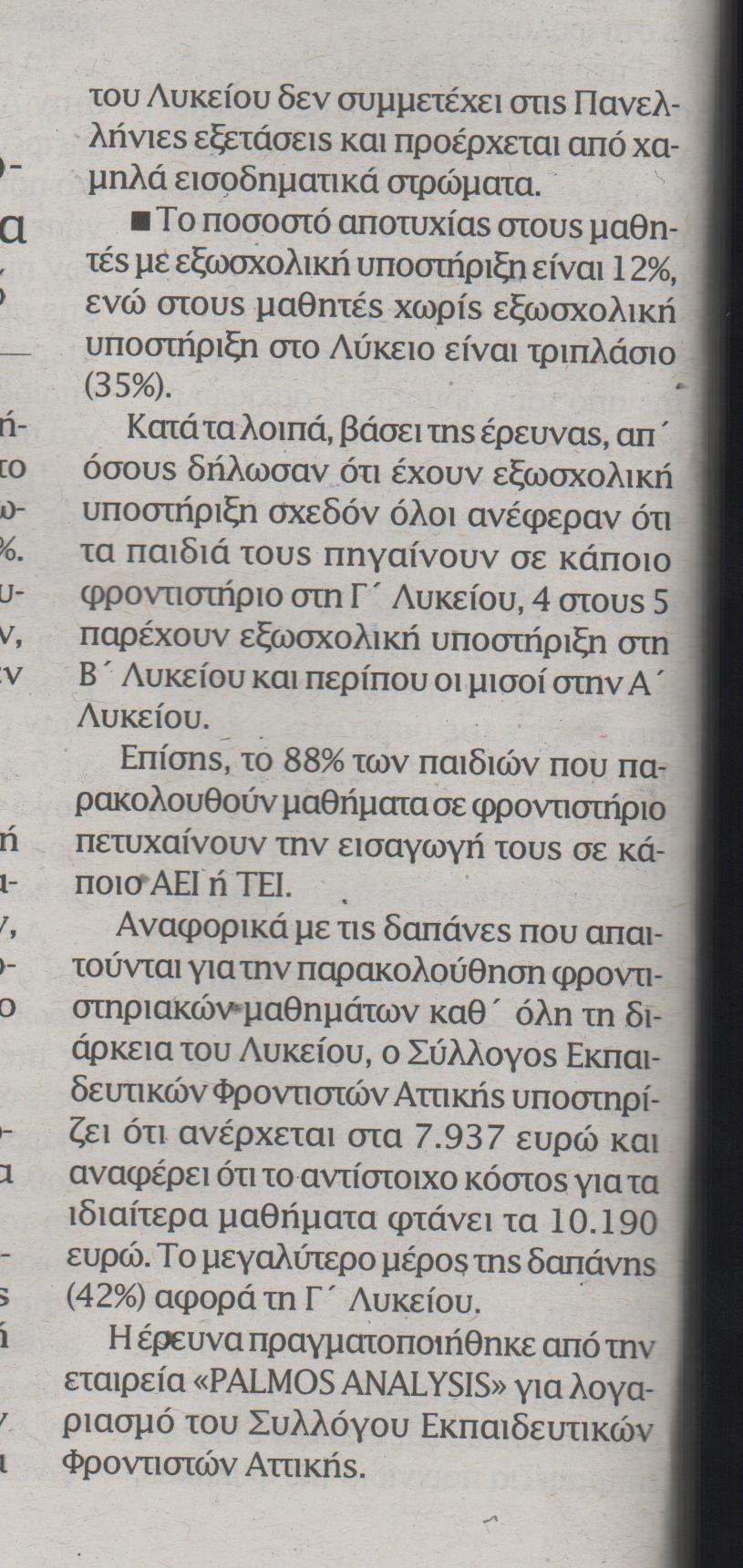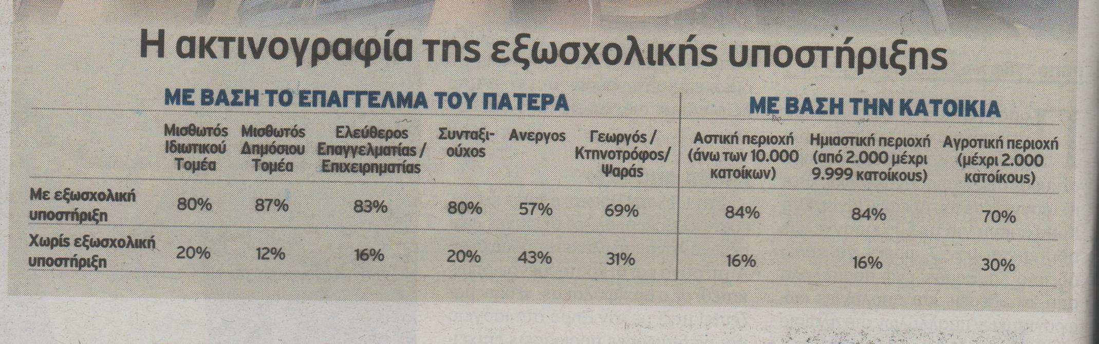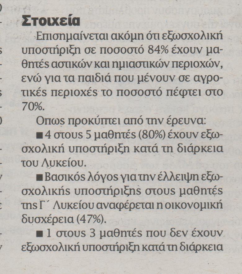 Αναγκαίο «κακό» για την πλειονότητα των μαθητών φαίνεται πως είναι η παρακολούθηση φροντιστηριακών μαθημάτων στο Λύκειο, προκειμένου να προετοιμαστούν για την εισαγωγή τους στα ιδρύματα της τριτοβάθμιας εκπαίδευσης, καθώς 8 στις 10 οικογένειες παρέχουν εξωσχολική υποστήριξη στα παιδιά τους.
