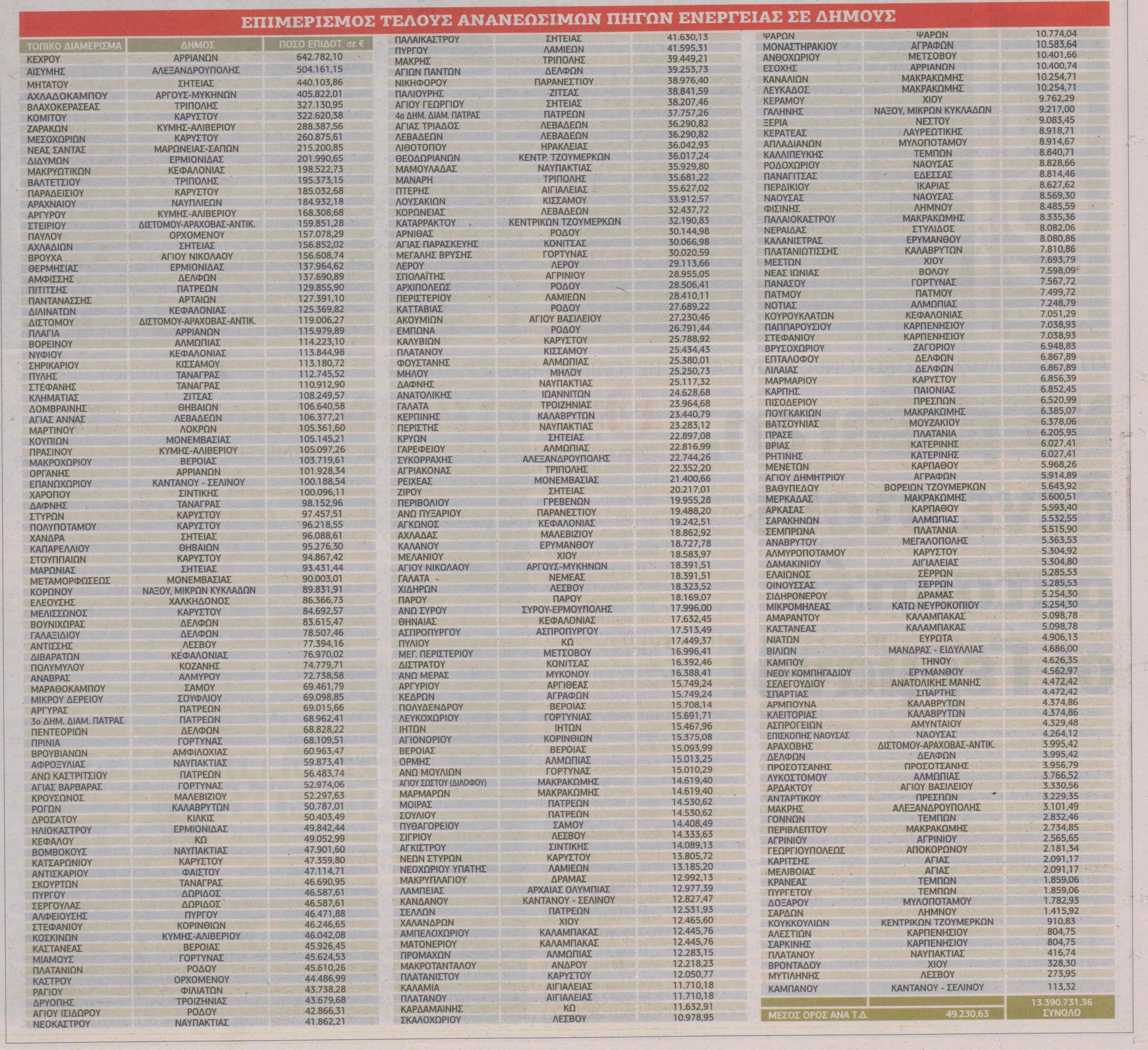 Τζάμπα ρεύμα θα πάρουν οι οικιακοί καταναλωτές 272 Δημοτικών και Τοπικών Διαμερισμάτων της χώρας, σε συνολικά 11 δήμους της χώρας, στις περιοχές των οποίων λειτουργούν σταθμοί παραγωγής ηλεκτρικής ενέργειας από Ανανεώσιμες Πηγές (αιολικά πάρκα, υδροηλεκτρικά, πλην φωτοβολταϊκών).