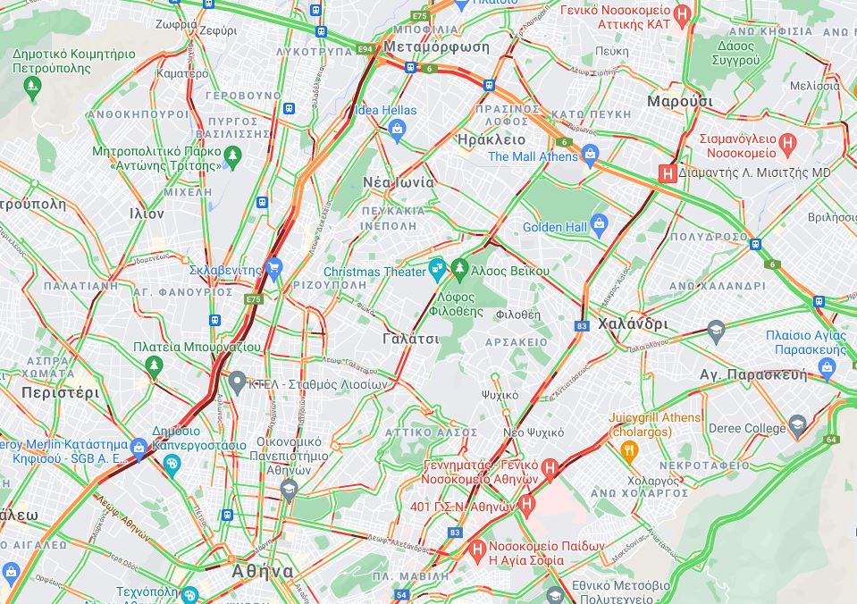 Με χαμηλές ταχύτητες κινούνται τα αυτοκίνητα στην Δουκίσσης Πλακεντίας στο Χαλάνδρι και σε τμήματα της Μεσογείων.