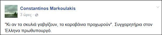 Με ανάρτησή του στην προσωπική του σελίδα στο Facebook ο Κωνσταντίνος Μαρκουλάκης τοποθετήθηκε για την επίτευξη συμφωνίας δίνοντας συγχαρητήρια στον Αλέξη Τσίπρα.