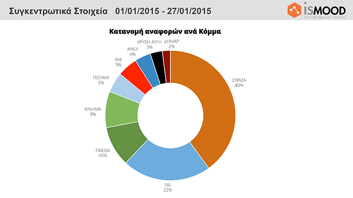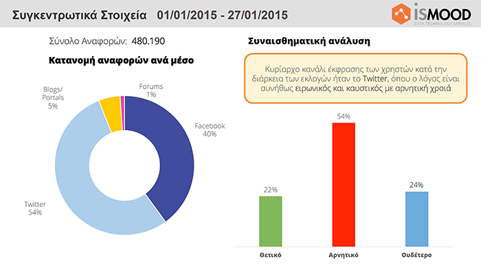 Όπως προκύπτει από το Monitoring Report για τις εθνικές εκλογές του 2015, που ετοίμασε για λογαριασμό του Συνδέσμου Επιχειρήσεων Πληροφορικής & Επικοινωνιών Ελλάδας, η νεοφυής εταιρεία isMOOD, το διάστημα 01/01/2015 – 27/01/2015, τα σχόλια, που κυριάρχησαν στο Twitter, ήταν – κατά κύριο λόγο – ειρωνικά, καυστικά και με αρνητική χροιά. Συγκεκριμένα, ενώ μόλις το 22% των αναφορών στο δημοφιλές κοινωνικό μέσο ήταν θετικές, τα αρνητικά σχόλια αντιπροσώπευσαν το 54% και τα ουδέτερα το υπόλοιπο 24%.