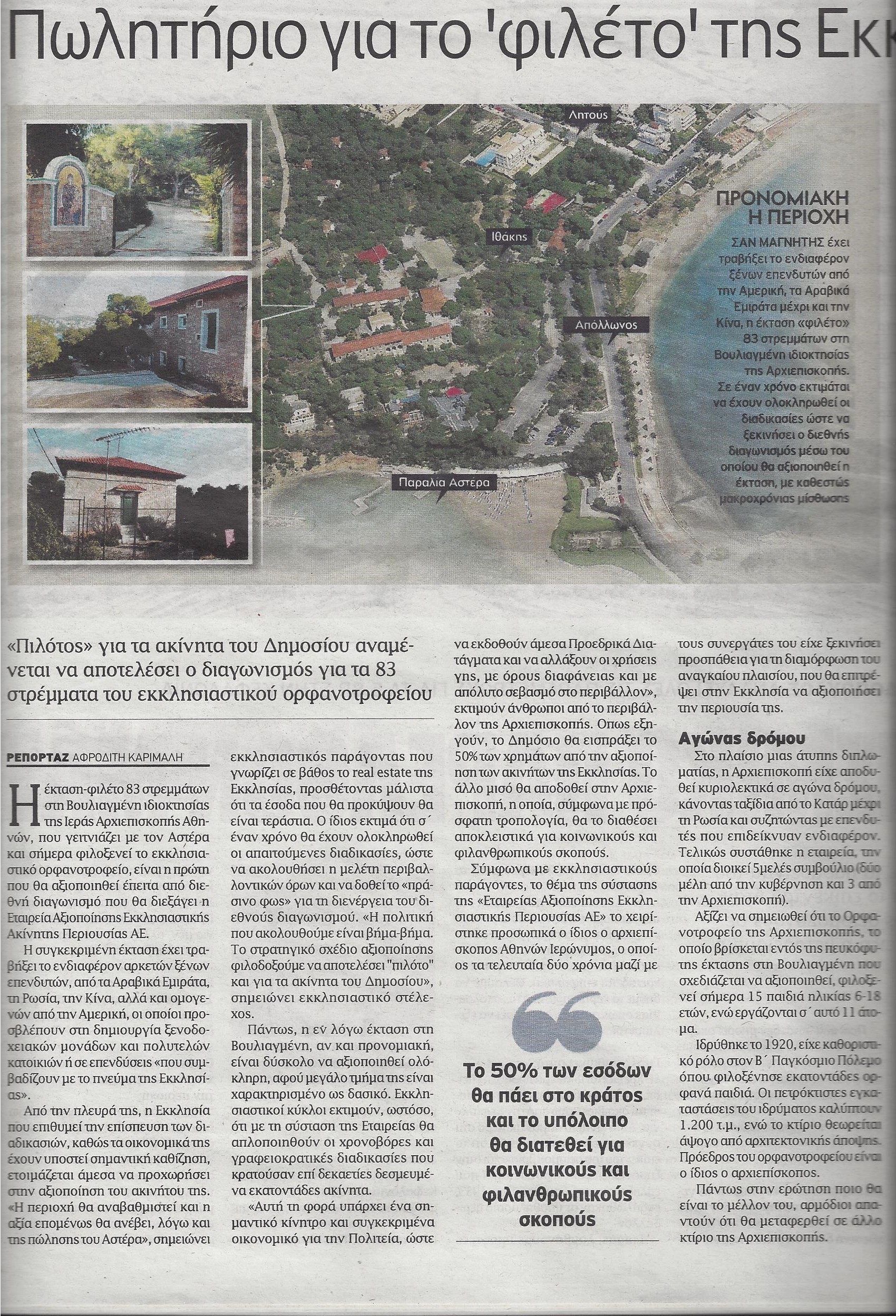 Η έκταση-φιλέτο 83 στρεμμάτων στη Βουλιαγμένη, ιδιοκτησίας της Ιεράς Αρχιεπισκοπής Αθηνών, που γειτνιάζει με τον Αστέρα και σήμερα φιλοξενεί το εκκλησιαστικό ορφανοτροφείο, είναι η πρώτη που θα αξιοποιηθεί έπειτα από διεθνή διαγωνισμό που θα διεξάγει η Εταιρεία Αξιοποίησης Εκκλησιαστικής Ακίνητης Περιουσίας Α.Ε.