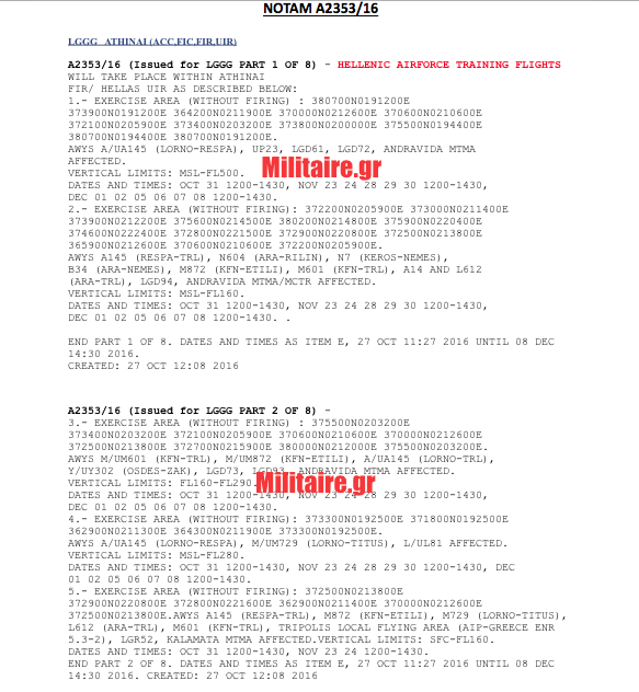 Οι ελληνικές αρχές εξέδωσαν την 27/10 την NOTAM A2353/16 με την οποία δεσμεύουν συνολικά 20 περιοχές εντός FIR ΑΘΗΝΩΝ για το χρονικό διάστημα 27/10 έως 8/12.
