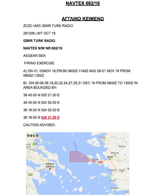 Αργά το απόγευμα η Τουρκία εξέδωσε την NAVTEX 682/16 με την οποία δεσμεύει θαλάσσια περιοχή στο Κεντρικό Αιγαίο (Δυτικά Ψαρών-Ανατολικά Σκύρου) για το δίμηνο Νοεμβρίου-Δεκεμβρίου 2016 (σε διάφορες ημερομηνίες).