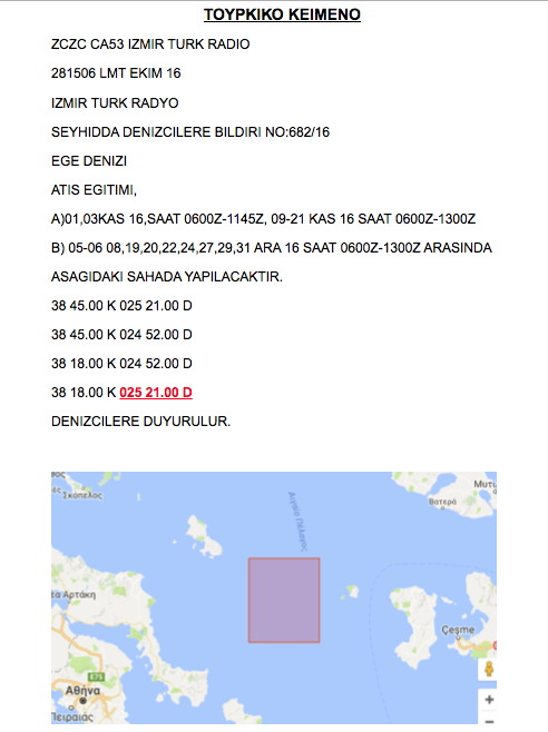 α. Υπάρχει διαφορά στις συντεταγμένες του τουρκικού κειμένου σε σχέση με το αγγλικό κείμενο της τουρκικής NAVTEX 682/16 με αποτέλεσμα οι συντεταγμένες του αγγλικού κειμένου να περιλαμβάνουν τα ΨΑΡΑ και μέρος της εδαφικής έκτασης της ΧΙΟΥ, ενώ η αγγλική έκδοση δεσμεύει την περιοχή μεταξύ ΣΚΥΡΟΥ – ΨΑΡΩΝ . Σημειωτέον ότι το τετράγωνο Ανατολικά ΣΚΥΡΟΥ-Δυτικά Ψαρών είναι ήδη δεσμευμένο από την τουρκική πλευρά μέχρι 31/10 (NAVTEX 536/16).