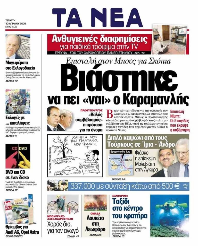 Σήμερα, η Εφημερίδα των Συντακτών έφερε στο φως έξι επιστολές, που στάλθηκαν στις 7, 8 και 9.4.2005 από τον τότε Πρωθυπουργό Κ. Καραμανλή στον καγκελάριο της Γερμανίας Γκέρχαρντ Σρέντερ, τον Πρωθυπουργό της Ισπανίας Χοσέ Λουίς Ροδρίγκεθ Θαπατέρο και τον Πρωθυπουργό του Λουξεμβούργου και πρόεδρο του Ευρωπαϊκού Συμβουλίου Ζαν-Κλοντ Γιούνκερ ζητώντας – σύμφωνα με το δημοσίευμα- να γίνει δεκτή η διπλή ονομασία «Makedonija-Skopje» και σκέτο «Makedonija». Πανομοιότυπες επιστολές απέστειλε ο υπουργός Εξωτερικών Πέτρος Μολυβιάτης προς τον Ολι Ρεν, επίτροπο της Ε.Ε. αρμόδιο για τη διεύρυνση, τον Ζαν Ασελμπορν, υπουργό Εξωτερικών του Λουξεμβούργου που είχε τότε την προεδρία της Ε.Ε., και τον Χαβιέ Σολάνα, ύπατο εκπρόσωπο για την Κοινή Εξωτερική Πολιτική και Πολιτική Ασφάλειας.