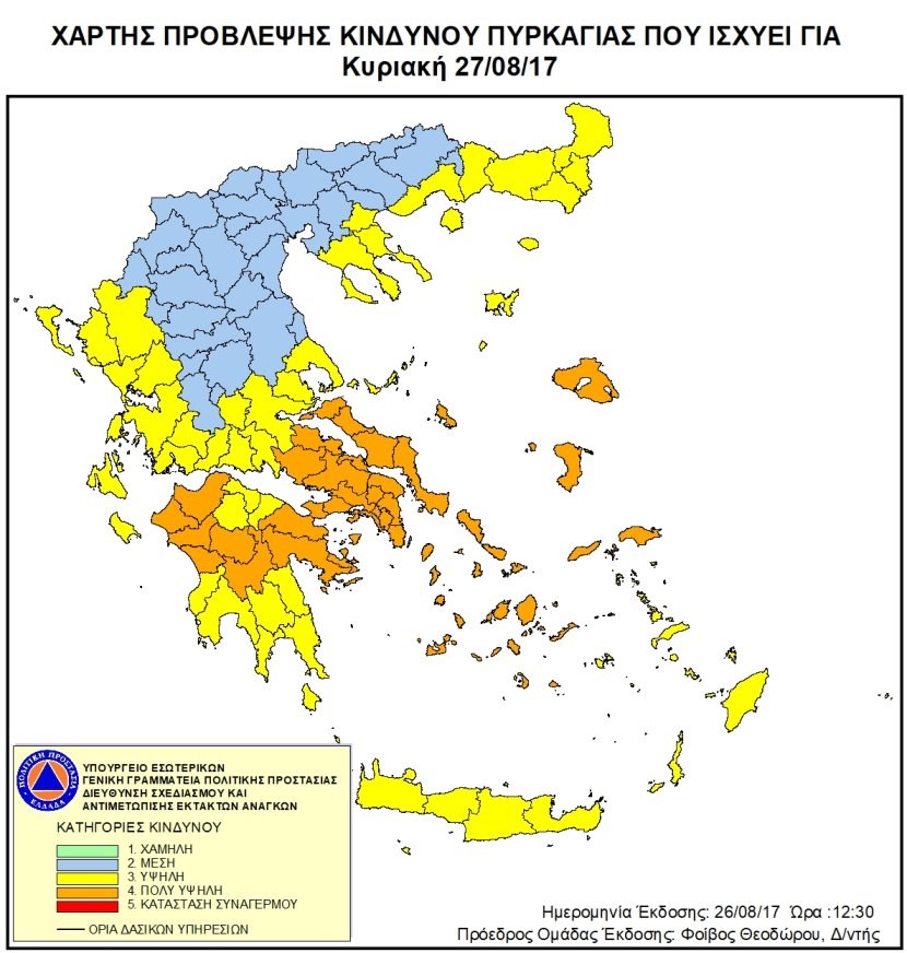 Πολύ υψηλός εξακολουθεί να είναι και σήμερα ο κίνδυνος για πυρκαγιά σε αρκετές περιοχές της χώρας. Σύμφωνα με το χάρτη πρόβλεψης προβλέπεται πολύ υψηλός κίνδυνος (δείκτης 4) για τους νομούς Αττικής, Εύβοιας, Βοιωτίας, Φθιώτιδας, Αχαΐας, Κορινθίας, Αργολίδας, Αρκαδίας, Ηλείας και για τα νησιά Σκύρο, Λέσβο, Χίο, Ψαρά, Σάμο, Ικαρία, καθώς και τις Κυκλάδες.Επίσης, το τελευταίο 24ωρο εκδηλώθηκαν 47 αγροτοδασικές πυρκαγιές, οι περισσότερες εκ των οποίων αντιμετωπίστηκαν άμεσα, σύμφωνα με την Πυροσβεστική.Στο νησί της Ζακύνθου, ξέσπασαν φωτιές στις περιοχές Καμπί, Πελιλόμπι, Σκούτα, Αναφωνήτρια, Καπελέτι- Ανω Βολίμες, Αργάσι και Αγαλάς. Συνολικά σε όλα τα μέτωπα των πυρκαγιών οι δυνάμεις που επιχειρούν είναι 76 πυροσβέστες με 37 οχήματα, 22 άτομα πεζοπόρο τμήμα, 3 ειδικά μηχανήματα, 2 αεροσκάφη και 1 ελικόπτερο. Κατά τη διάρκεια της ημέρας οι δυνάμεις θα ενισχυθούν με 20 πυροσβέστες, 5 οχήματα και 10 άτομα πεζοπόρο τμήμα.Παράλληλα, σε εξέλιξη βρίσκονται πυρκαγιές στις περιοχές Αμόργιανοι Αμφιλοχίας, Ασβεστοχώρι Ιωαννίνων και Παπαδάτες Πρέβεζας.Ακόμη, οριοθετημένες είναι οι φωτιές στις περιοχές Καντήλι Μεγάρων Αττικής, Κουβαράς Αττικής, Άγιοι Θεόδωροι Μεγαλόπολης, Άγιος Νικόλαος Αχαΐας, Σαντομέρι Αχαΐας και Ταξιάρχες Θέρμου Αιτωλοακαρνανίας.Τέλος, υπό μερικό έλεγχο τέθηκαν οι πυρκαγιές στις περιοχές Βολίμες- Σεβέικα Ζακύνθου, Μακρύς Γιαλός Ζακύνθου, Κακή Βίγλα Σαλαμίνας και Προφίλια Ρόδου.