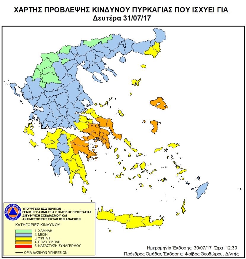 Σύμφωνα με τον Χάρτη Πρόβλεψης Κινδύνου Πυρκαγιάς που εκδίδει η Γενική Γραμματεία Πολιτικής Προστασίας του Υπουργείου Εσωτερικών (www.civilprotection.gr), για σήμερα Δευτέρα 31 Ιουλίου 2017, προβλέπεται πολύ υψηλός κίνδυνος πυρκαγιάς (κατηγορία κινδύνου 4) για τις εξής περιοχές: