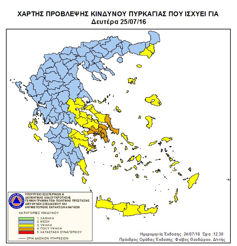 Πολύ υψηλός κίνδυνος πυρκαγιάς (κατηγορία κινδύνου 4) για σήμερα, Δευτέρα 25 Ιουλίου 2016.