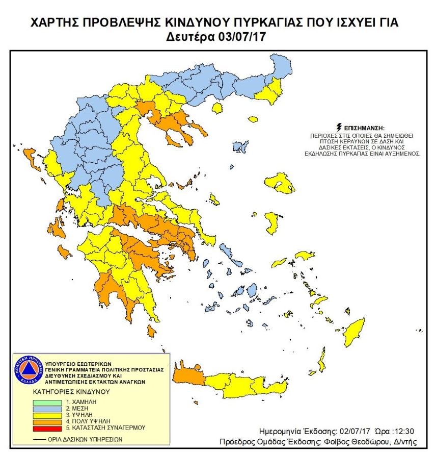 Σύμφωνα με το Χάρτη Πρόβλεψης Κινδύνου Πυρκαγιάς για σήμερα, Δευτέρα 3 Ιουλίου, προβλέπεται πολύ υψηλός κίνδυνος πυρκαγιάς (κατηγορία κινδύνου 4) για τις εξής περιοχές: