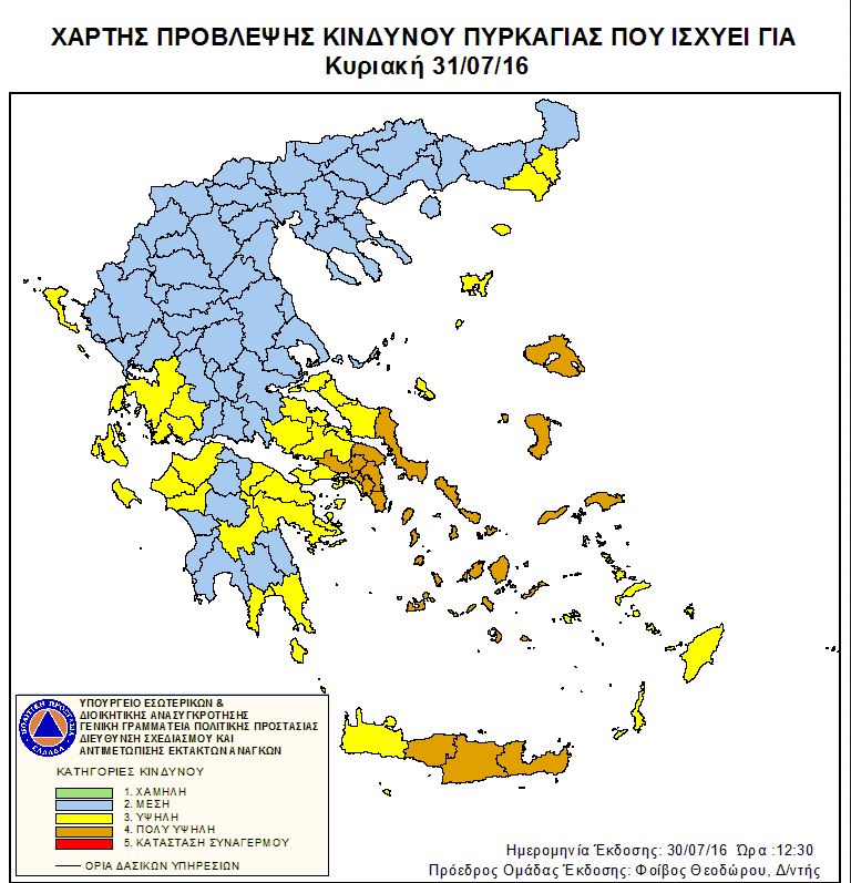 Σύμφωνα με το Χάρτη Πρόβλεψης Κινδύνου Πυρκαγιάς που εκδίδει η Γενική Γραμματεία Πολιτικής Προστασίας του Υπουργείου Εσωτερικών και Διοικητικής Ανασυγκρότησης, για σήμερα, Κυριακή, προβλέπεται πολύ υψηλός κίνδυνος πυρκαγιάς (κατηγορία κινδύνου 4) για τις εξής περιοχές: