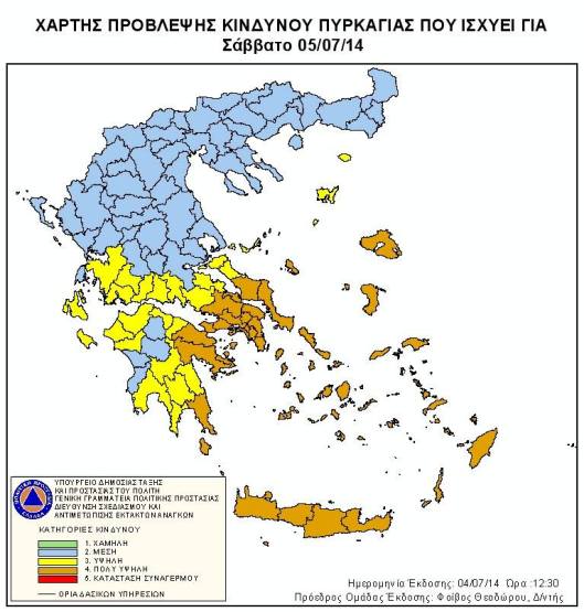 Για σήμερα προβλέπεται πολύ υψηλός κίνδυνος πυρκαγιάς (κατηγορία κινδύνου 4), σύμφωνα με το Χάρτη Πρόβλεψης Κινδύνου Πυρκαγιάς που εκδίδει η Γενική Γραμματεία Πολιτικής Προστασίας του υπουργείου Δημόσιας Τάξης και Προστασίας του Πολίτη, για τις εξής περιοχές: