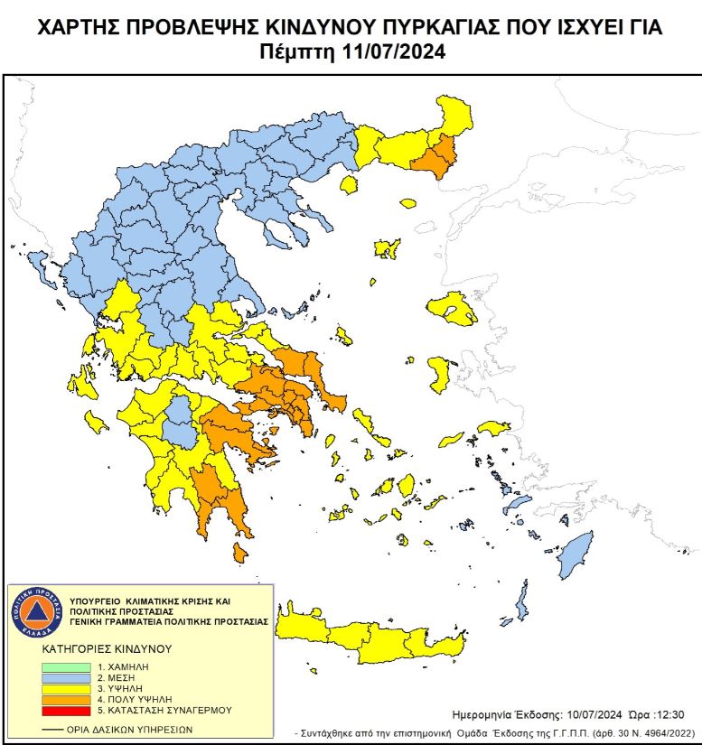 Συγκεκριμένα, σύμφωνα με τον Χάρτη Πρόβλεψης Κινδύνου Πυρκαγιάς που εκδίδει η Γενική Γραμματεία Πολιτικής Προστασίας του Υπουργείου Κλιματικής Κρίσης & Πολιτικής Προστασίας (civilprotection.gov.gr), για αύριο Πέμπτη 11 Ιουλίου 2024, προβλέπεται πολύ υψηλός κίνδυνος πυρκαγιάς (κατηγορία κινδύνου 4) για τις εξής περιοχές: