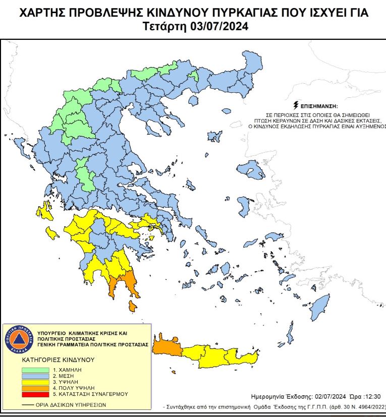 Συγκεκριμένα, σύμφωνα με τον Χάρτη Πρόβλεψης Κινδύνου Πυρκαγιάς που εκδίδει η Γενική Γραμματεία Πολιτικής Προστασίας του Υπουργείου Κλιματικής Κρίσης & Πολιτικής Προστασίας (civilprotection.gov.gr), για αύριο Τετάρτη 03 Ιουλίου 2024, προβλέπεται πολύ υψηλός κίνδυνος πυρκαγιάς (κατηγορία κινδύνου 4) για τις εξής περιοχές: