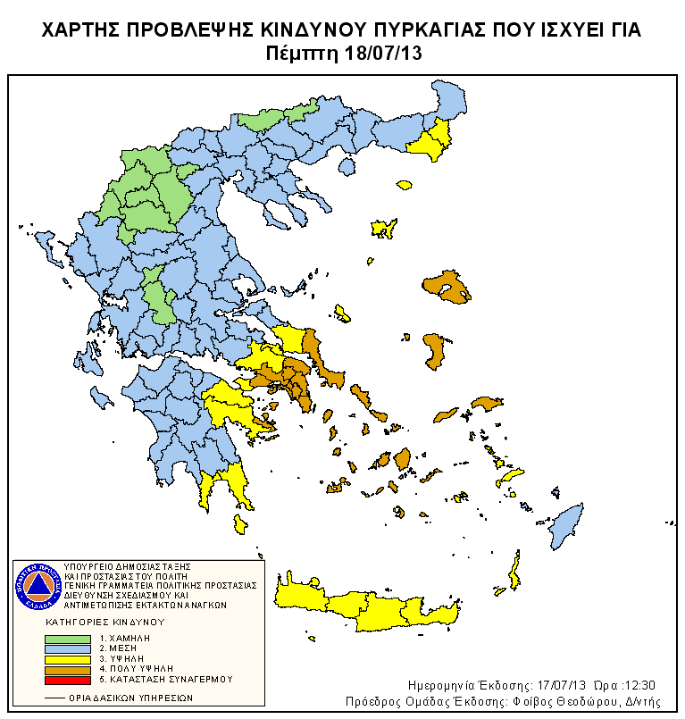 Χάρτη εξέδωσε η Γενική Γραμματεία Πολιτικής Προστασίας επισημαίνοντας τον υψηλό κίνδυνο εκδήλωσης πυρκαγιών την Πέμπτη 18 Ιουλίου σε περιοχές κυρίως της Ανατολικής Στερεάς, της Εύβοιας και της νησιωτικής Ελλάδας.