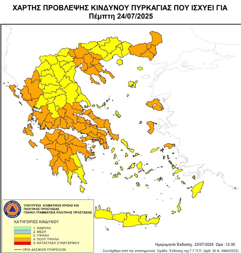 Συγκεκριμένα, σύμφωνα με τον Χάρτη Πρόβλεψης Κινδύνου Πυρκαγιάς που εκδίδει η Γενική Γραμματεία Πολιτικής Προστασίας του Υπουργείου Κλιματικής Κρίσης & Πολιτικής Προστασίας (civilprotection.gov.gr), για αύριο Πέμπτη 24 Ιουλίου 2025, προβλέπεται πολύ υψηλός κίνδυνος πυρκαγιάς (κατηγορία κινδύνου 4) για τις εξής περιοχές: