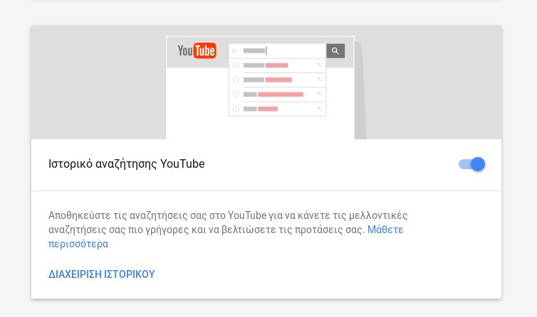 Όπως φαίνεται και στις παρακάτω εικόνες, ο συγκεκριμένος χρήστης έχει επιλέξει την απενεργοποίηση της δραστηριότητα ιστού και εφαρμογών, αλλά ενεργοποιημένο το ιστορικό αναζήτησης του Youtube.