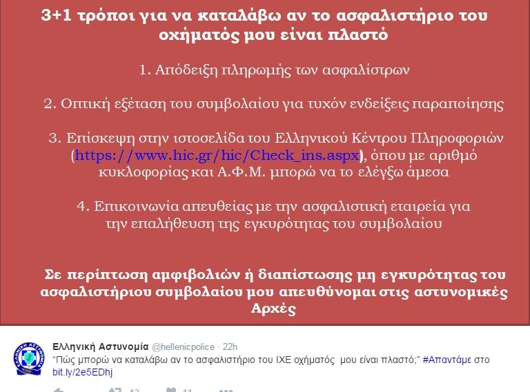 Η Αστυνομία μέσω Twitter ενημερώνει τους πολίτες για τους τρόπους με τους οποίους μπορούν να καταλάβουν αν το ασφαλιστήριο του αυτοκινήτου τους είναι πλαστό. Σημειώνεται ότι κατά καιρούς έχουν παρατηρηθεί περιστατικά που αφορούν στην έκδοση πλαστών ασφαλιστήριων συμβολαίων Ι.Χ.Ε. αυτοκινήτων, με θύματα ανυποψίαστους πελάτες – «ασφαλιζόμενους».