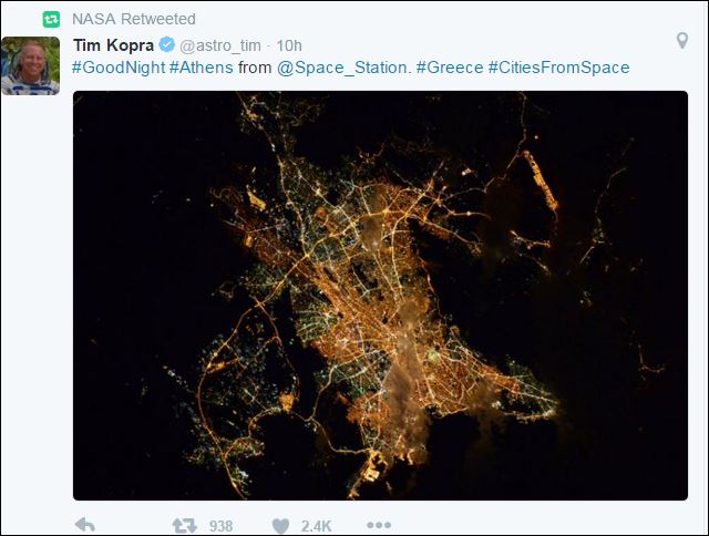 Συγκεκριμένα, ο αστροναύτης ανέβασε τη φωτογραφία της Αθήνας , όπως φαίνεται από τον Διεθνή Διαστημικό Σταθμό και συνόδευσε την ανάρτησή του με την εξής λεζάντα: «Καληνύχτα Αθήνα».
