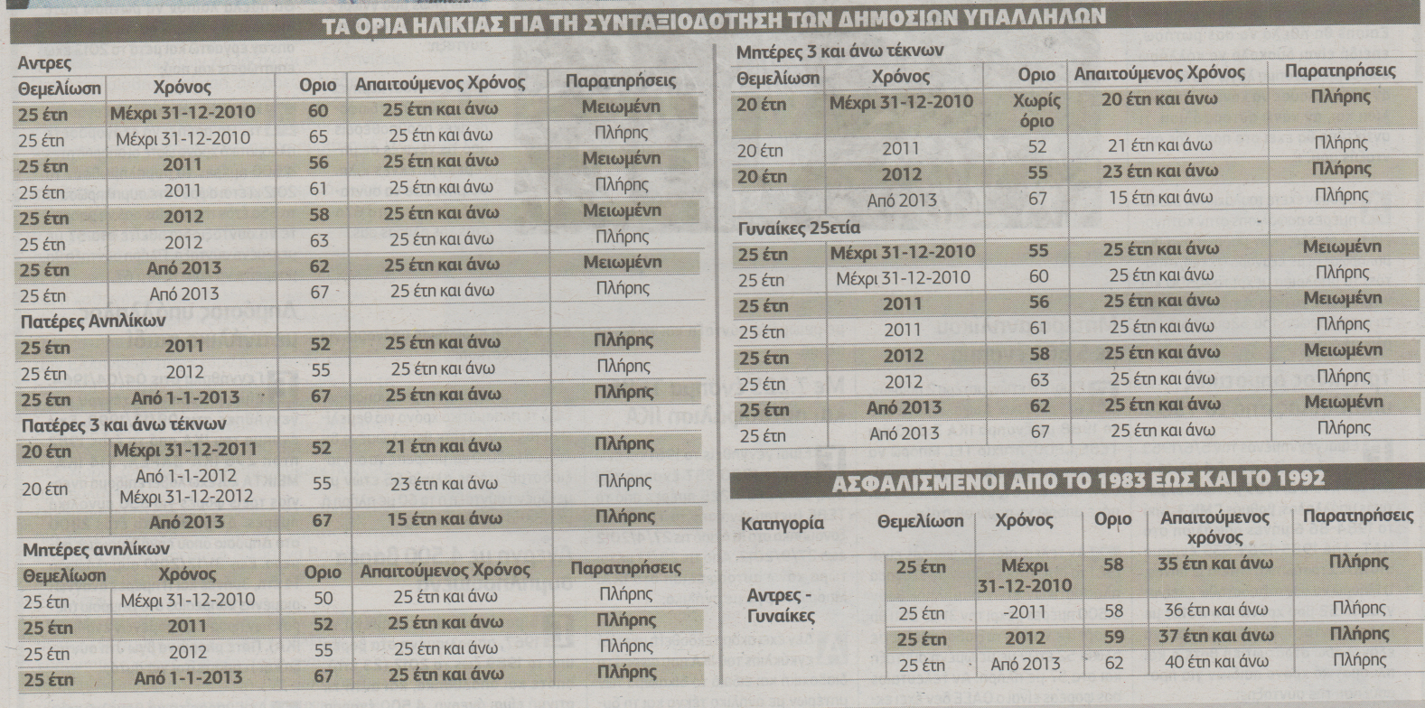 Σημειώνεται πως τη συγκεκριμένη διετία -δηλαδή το 2011 και το 2012- ισχύουν ενιαίες ρυθμίσεις για άντρες και γυναίκες με ανήλικα τέκνα. Ειδικές διατάξεις προβλέπονται για τους τριτέκνους, όπου η θεμελίωση δικαιώματος γίνεται μόνο με 20 έτη ασφάλισης.